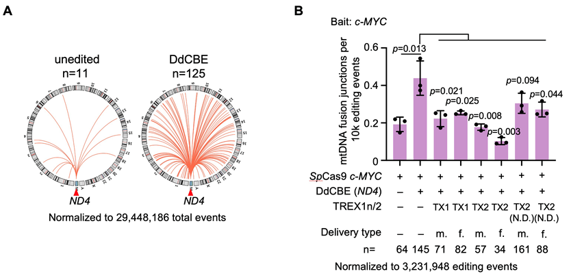 那么由于线粒体基因编辑导致的线粒体DNA碎片是否有可能插入到核基因组中呢?作者利用PEM-seq发现,在mitoTALEN编辑后线粒体DNA与核基因组整合序列的断点大多发生在mitoTALEN的编辑窗口内。同样的,在DdCBE编辑后也能发现编辑位点与核基因组的整合,证明线粒体编辑器同样可以导致线粒体DNA插入到核基因组中(图二A)。在细胞中核酸外切酶TREX1和TREX2会清除细胞质中游离的DNA片段从而避免细胞炎症反应的过度激活6。作者发现,在编辑过程中同时表达TREX1或TREX2可以显著降低编辑过程中线粒体DNA的插入(图二B),为解决这一编辑安全隐患提出了解决的思路。