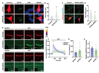 研究团队通过敲除纤毛特异性蛋白生长抑素3型受体(somatostatin receptor 3,SSTR3),评估了其对神经元初级纤毛的影响。结果表明,SSTR3的表达水平直接影响初级纤毛的长度:过表达SSTR3会显著促进纤毛延长,而敲除SSTR3则导致纤毛缩短(图1. A-D)。此外,研究利用特异性靶向初级纤毛的荧光钙指示剂探针进一步发现,SSTR3敲除会显著降低纤毛内的钙信号传导幅度,并延长信号达到峰值的时间,这表明纤毛信号传导功能受到了干扰(图1. E-H)。