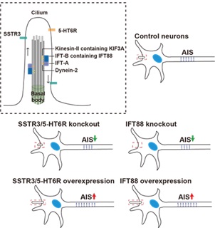 图2. 纤毛蛋白的异常表达影响了AIS的长度。左上方为初级纤毛结构及纤毛相关蛋白在纤毛上定位示意图,下方为相应纤毛蛋白异常表达对AIS长度调控示意图。