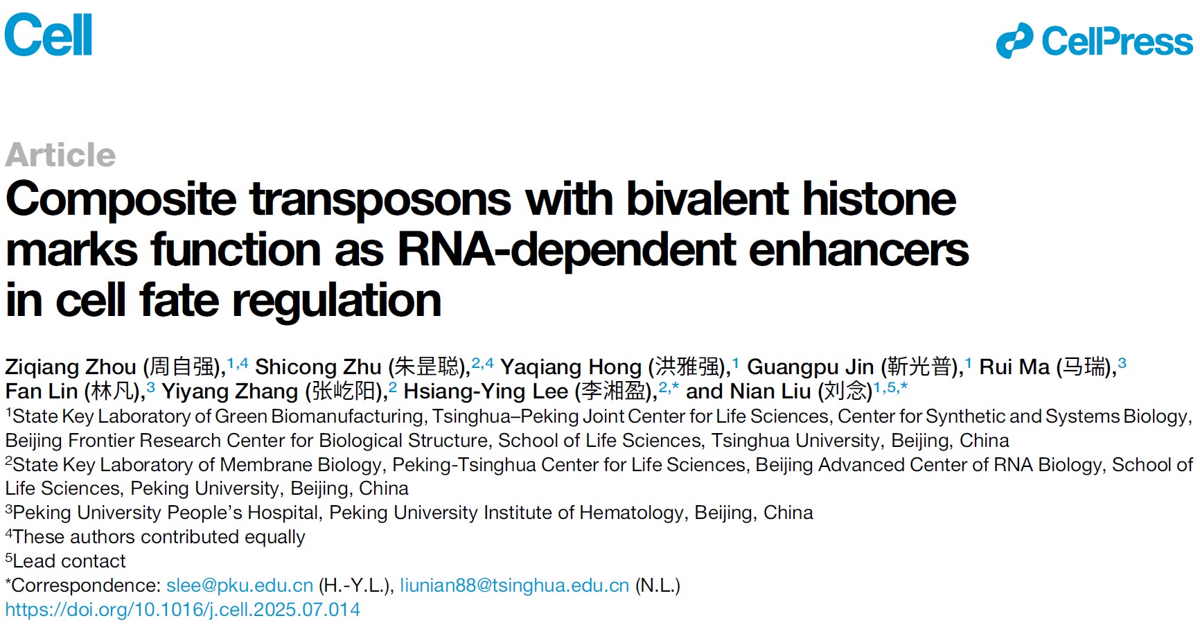 2025年8月6日,PA视讯游戏平台官网、北大-清华生命科学联合中心李湘盈课题组联合清华大学PA视讯游戏平台官网、清华-北大生命科学联合中心刘念课题组在《细胞》(Cell)杂志上在线发表了题为“携带二价组蛋白修饰的复合型转座子作为RNA依赖性增强子调控细胞命运”(Composite transposons with bivalent histone marks function as RNA-dependent enhancers in cell fate regulation)的研究论文。该研究首次揭示了H3K9me3和H3K27ac标记的二价染色质对复合型转座子SVA的协同调控机理和生物学功能,并证明了SVA的RNA依赖性增强子活性及其在造血系统分化和衰老相关髓系偏好性造血中的重要生理意义,提示其有望成为干预造血发育异常和造血衰老的潜在靶标。