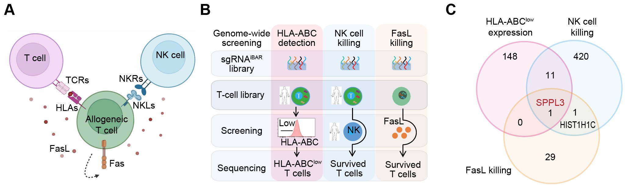 为寻找能够同时规避宿主与CAR-T细胞免疫互斥的工程化策略,魏文胜团队利用全基因组 CRISPR 敲除文库,系统筛选影响异体T细胞持久性的关键基因及其调控网络。研究设想通过筛选获得三类功能改造:(1)降低HLA-ABC的可检测性,从而削弱TCR介导的识别与清除;(2)增强对NK细胞杀伤的抵抗力;(3)提升长期存活性,尤其是抵御FasL诱导的凋亡。令人意外的是,这三类表型最终均指向同一关键基因——SPPL3(图一)。其敲除不仅可同时降低HLA-ABC的表面可及性、增强抗NK细胞能力并延长T细胞存活,还揭示了一个保守而普遍的免疫调控机制。已有研究为此提供了重要线索:肿瘤细胞缺失 SPPL3后可借此机制逃避免疫清除 1;韩为东团队在肿瘤抵抗CAR-T杀伤的全基因组筛选中同样发现SPPL3排名首位 2;Singh团队则报道Nalm6肿瘤细胞在SPPL3缺失后获得对CAR-T杀伤的抵抗 3。这些发现共同提示,SPPL3在癌症免疫逃逸与T细胞免疫耐受中具有普遍作用。