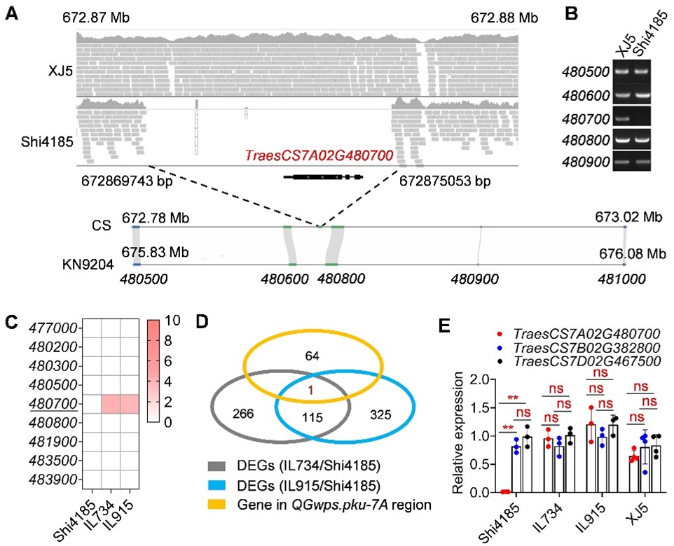 研究团队利用小麦亚种资源新疆小麦XJ5与主栽品种石4185构建的基因组片段导入系群体为基础,通过综合运用导入系群体关联分析、组织特异转录组分析和比较基因组方法,精准定位和分离出一个编码镁离子螯合酶亚基I的编码基因CHLI-A(图1)。该基因在小麦自然群体中呈现“存在-缺失”多态性(presence and absence variation),在石4185中为缺失,而在XJ5中存在。