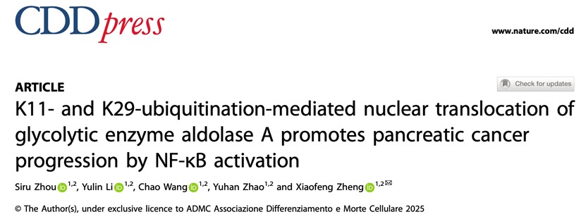 2025年10月4日,PA视讯游戏平台官网郑晓峰教授团队在Cell Death & Differentiation 期刊发表了题为K11- and K29-ubiquitination-mediated nuclear translocation of glycolytic enzyme aldolase A promotes pancreatic cancer progression by NF-κB activation的研究成果。该研究揭示了醛缩酶A(ALDOA)在细胞核内不依赖于其醛缩酶活性的非经典功能,即其在K11和K29类型特异性泛素化修饰的精细调控下发生核转位,通过激活NF-κB信号通路促进胰腺癌的发生发展。该研究揭示ALDOA在癌症信号转导通路中发挥重要调控作用。