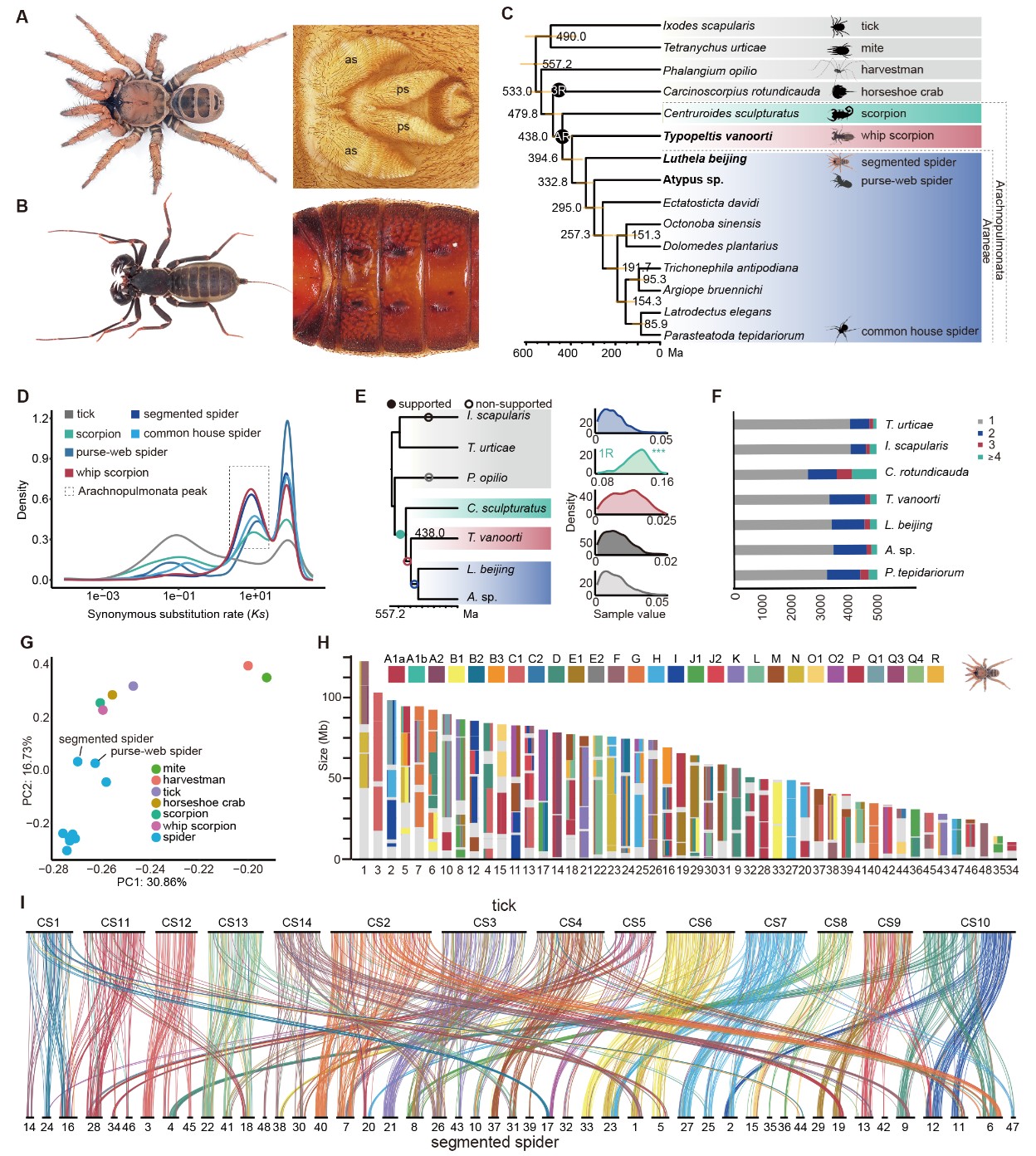 图1. 节板蛛、地蛛与鞭蝎的基因组演化