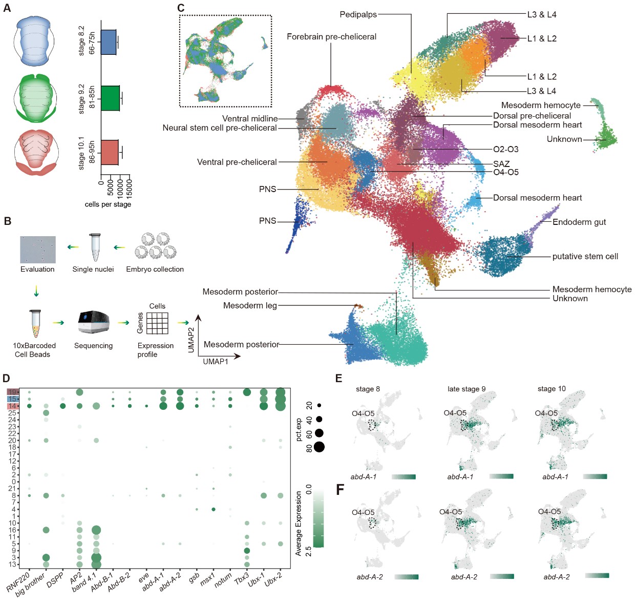 为了更深入地解析纺器形成过程中的基因调控模式,作者对蜘蛛胚胎在纺器出现前后的关键时期进行了单细胞测序。伪时序和差异表达分析识别出一批可能在纺器形成中发挥核心作用的候选基因,并为“纺器源自足”的假说提供了支持(图3)。进一步的基因表达分析与 CRISPR/Cas9功能实验显示,dac-1 的调控活动在腹部新区域被重新部署,这一结果强化了上述假设(图4)。