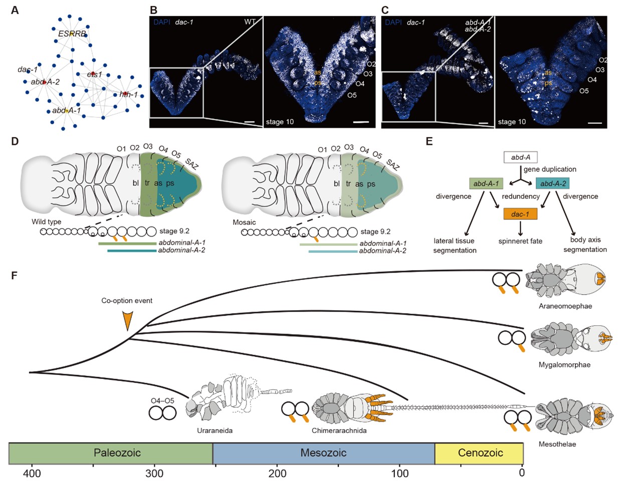 综合多组学数据和功能证据,本研究对纺器的遗传基础与演化路径进行了系统阐释。作者发现,abd-A 的两个基因拷贝共同促进了第四和第五腹节上纺器的形成并招募了足模式基因dac-1参与纺器的精细构建。这不仅填补了节肢动物早期关键结构如何出现的知识空白,也支持了重复基因的网络在复杂形态创新中发挥核心作用的观点(图5)。