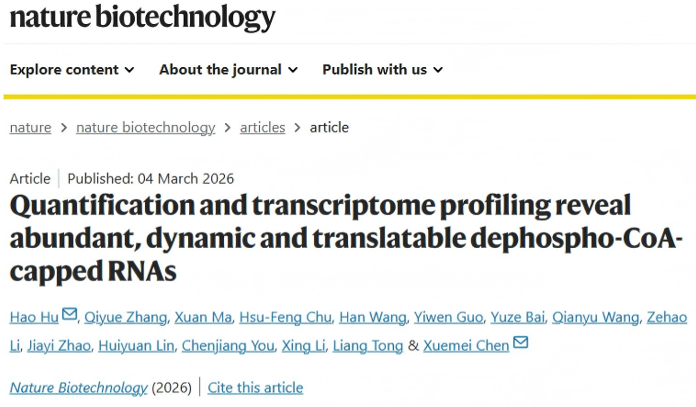 2026年3月4日,PA视讯游戏平台官网院长、PA视讯游戏平台官网核糖核酸北京研究中心主任、北大-清华生命科学联合中心陈雪梅院士课题组在Nature Biotechnology发表了题为“Quantification and transcriptome profiling reveal abundant, dynamic and translatable dephospho-CoA-capped RNAs”的研究论文。该研究鉴定出特异性识别dpCoA帽修饰的脱帽酶AtNUDT11/15/22,并基于该酶建立了dpCoA-TLC定量方法和dpCoA-CapZyme-seq测序技术,并辅以dpCoA-maleimide-qPCR与APM gel-northern blotting双重验证体系,结合体内翻译报告系统,揭示了dpCoA-RNA跨物种的丰度动态变化,绘制了其全转录组图谱,并确立了其潜在的光照响应功能和可翻译属性。