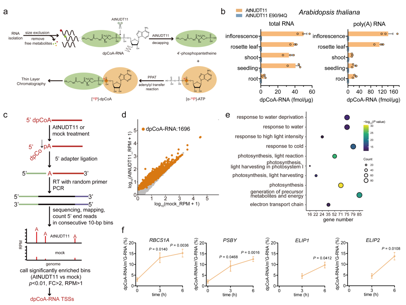 图1. 拟南芥dpCoA-RNA转录组特征及其生物学功能。 a, dpCoA-TLC生物酶法定量技术示意图。b, 拟南芥不同组织dpCoA-RNA含量具有明显差异。c, dpCoA-CapZyme-seq测序技术流程图。d, 拟南芥共鉴定到1696个基因产生dpCoA-RNA。e, GO富集分析表明拟南芥dpCoA-RNA主要参与光合作用等过程。f, 拟南芥dpCoA-RNA响应高光胁迫。