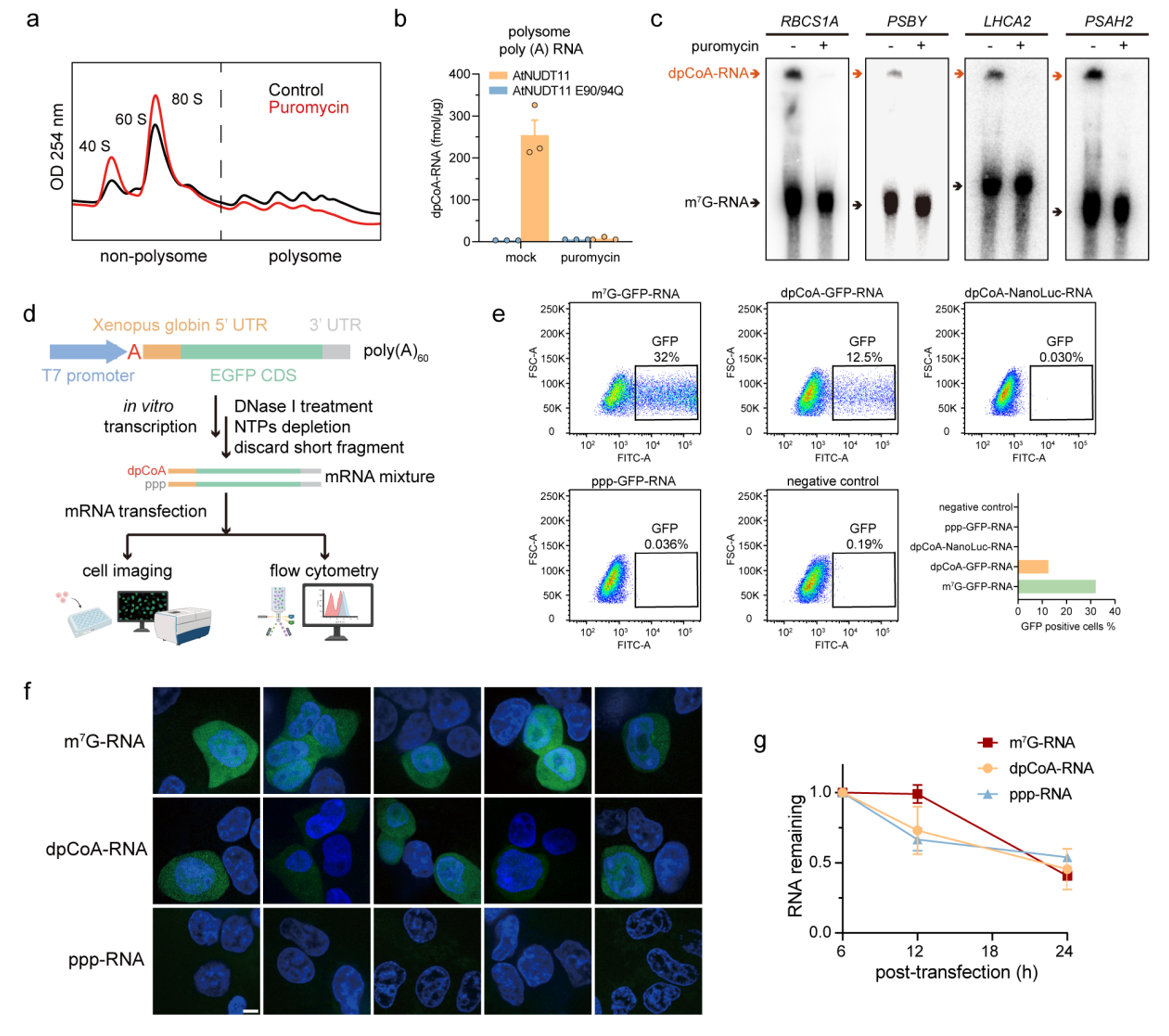 图2. dpCoA-RNA具有可翻译属性。 a, 蔗糖梯度分离拟南芥多聚合核糖体。b, dpCoA-TLC检测结果表明puromycin翻译抑制剂处理后dpCoA-RNA从多聚核糖体上解离。c, APM gel-northern blotting检测表明puromycin翻译抑制剂处理后特定基因dpCoA-RNA从多聚核糖体上解离。d, 细胞内dpCoA-RNA翻译体系示意图。e,流式细胞仪显示m7G-GFP-RNA与dpCoA-GFP-RNA均能在转染细胞中表达出荧光蛋白。f, 共聚焦显微观察显示m7G-GFP-RNA与dpCoA-GFP-RNA转染细胞能表达GFP荧光。g, 转染后细胞体内各类型体外转录RNA的稳定性。