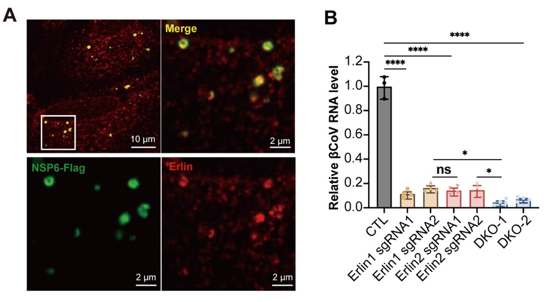 陈晓伟团队长期从事脂质代谢研究,聚焦内质网脂层平衡在维系细胞与机体稳态中的基础性作用,并借助病毒对宿主脂质代谢的胁持作为工具开展研究。研究团队通过鼠源冠状病毒感染实验发现,Erlin复合物可被病毒蛋白NSP6招募,并参与冠状病毒RNA复制过程(图2)。值得关注的是,近期国际团队研究还报道Erlin在病毒包装成熟阶段可能发挥抑制作用,可能与其调控胆固醇代谢相关 (Teo, Wong et al. 2023)。这提示Erlin在病毒感染过程中具有阶段依赖性的双重调控功能。