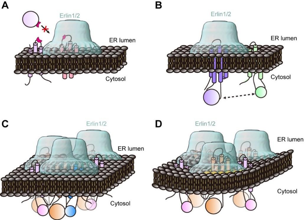 图3. Erlin1/2复合物介导膜微功能域组织及蛋白调控的机制模型