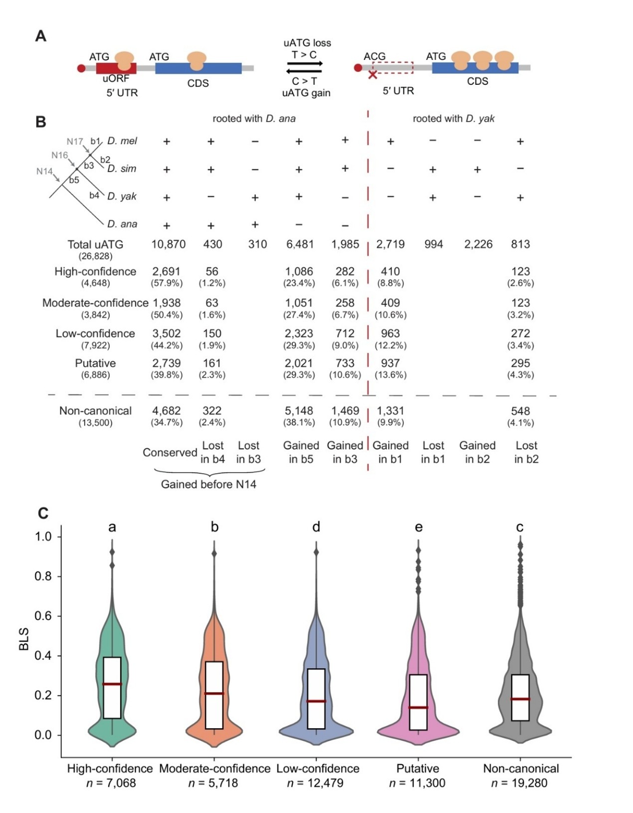 图1:uORF在果蝇演化过程中的“获得/丢失”动态。 A. 由点突变导致的uATG获得与丢失的示意图;B. 在D. melanogaster、D. simulans、D. yakuba和D. ananassae四个物种中推断出的uATG获得与丢失事件数;C. 不同翻译证据强度的uORF在演化中的保守比例。