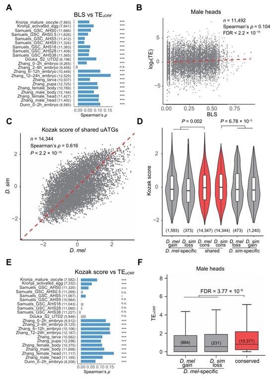 图2:保守uORF具有更高的翻译效率和优化的Kozak序列。A. 果蝇21个样本中uORF翻译效率(TE)与分支长度得分(BLS)的相关性分析;B. 雄性头部样本中uORF TE与BLS的相关性散点图;C. D. melanogaster与D. simulans间直系同源uATG的Kozak得分相关性分析;D. 保守uORF与物种特异性uORF在D. melanogaster和D. simulans中的Kozak得分比较,保守uORF显著更高;E. 果蝇21个样本中uORF TE与Kozak得分的相关性分析;F. 雄性头部样本中保守uORF与物种特异性uORF的TE比较,保守uORF翻译效率显著更高。