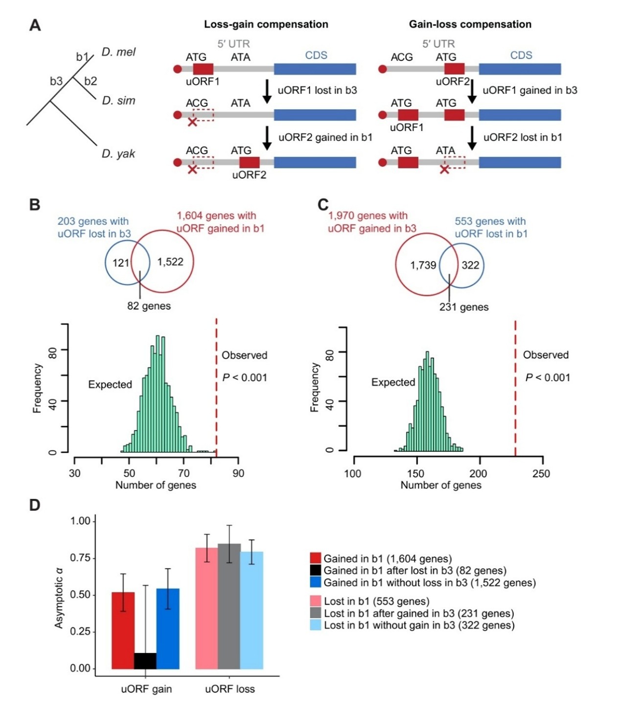 图3:uORF演化补偿机制及其选择压力分析。A. uORF演化补偿模式示意图;B. uORF“丢失-获得”补偿的观测值与期望值比较;C. uORF“获得-丢失”补偿的观测值与期望值比较;D. 不同类别uATG获得与丢失事件的渐近McDonald-Kreitman检验估计值(α)。