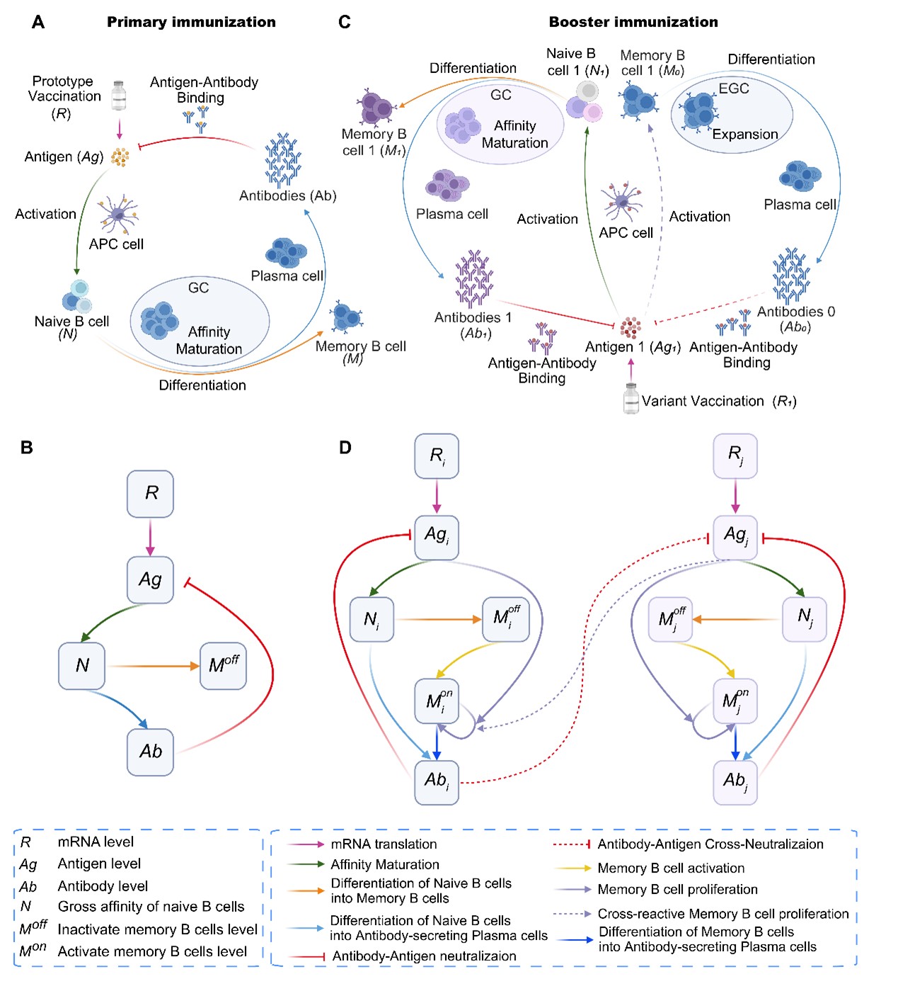A. 初次免疫过程中,mRNA来源抗原诱导初始B细胞活化、亲和力成熟、记忆B细胞形成及抗体产生的示意图;B. 初次免疫阶段关键免疫变量之间的抽象动力学关系;C. 异源加强免疫时,既有记忆B细胞与新激活的初始B细胞共同参与应答的示意图;D. 多变异抗原条件下交叉中和与交叉记忆激活的整体建模框架。