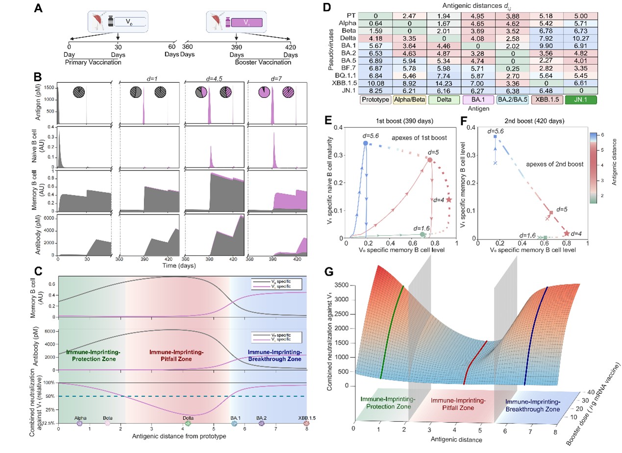 A. 模拟的接种流程:两剂原始株疫苗后,再进行两剂变异株加强;B. 在不同抗原距离条件下,抗原、初始B细胞、记忆B细胞与抗体的动态变化;C. 变异株中和能力随抗原距离变化呈U形分布,据此划分保护区、陷阱区和突破区;D. 主要SARS-CoV-2变异株与原始株之间的实验抗原距离及其在三类分区中的对应位置;E. 第一次加强免疫过程中,变异株特异性初始B细胞与原始株特异性记忆B细胞之间的竞争轨迹,展示不同免疫印记分区内早期应答主导群体的变化;F. 第二次加强免疫过程中,变异株特异性记忆B细胞与原始株特异性记忆B细胞之间的竞争轨迹,反映免疫特异性在连续加强后的重塑方向。G. 加强剂量与抗原距离共同塑造对变异株中和能力的变化趋势。