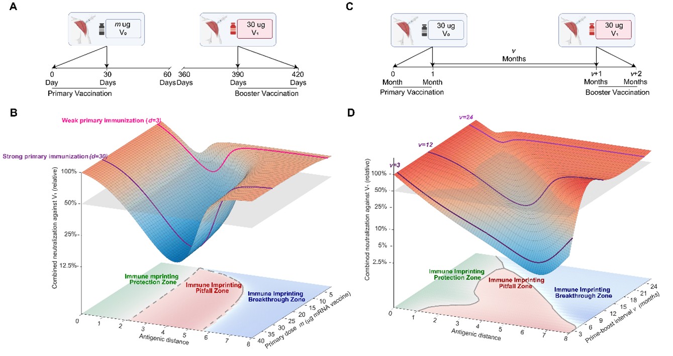 A-B. 初免剂量与抗原距离共同塑造加强接种对变异株中和能力,并影响免疫印记保护区、陷阱区和突破区的分布范围。C-D. 初免—加强间隔与抗原距离共同塑造加强接种对变异株中和能力,并影响免疫印记保护区、陷阱区和突破区的分布范围。