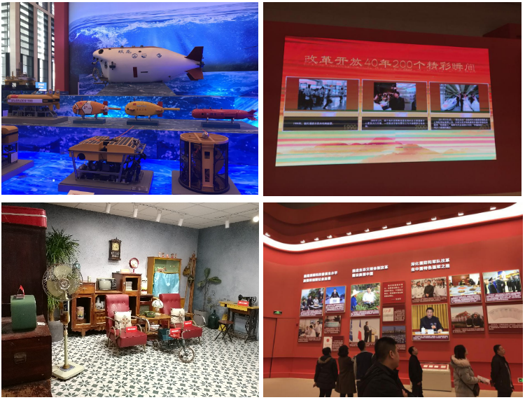 第一展区是开篇视频《伟大的变革》,集中展示了我党毫不动摇的坚持和发展中国特色社会主义,坚持以人民为中心的发展思想以及将改革进行到底的政治魄力和坚定决心。第二展区是《壮美的篇章》,通过实物模型等方式,再现了改革开放以来的大喜事。首先映入眼帘的是两辆跑车,清新脱俗、气质典雅。正中央相对而立的,是航天事业和深海探测的专题模型展览。模型身后的展板上,分别写着“可上九天揽月”,“可下五洋捉鳖”,这两句出自毛主席《水调歌头·重上井冈山》的诗句,在此处淋漓尽致地体现了时代变迁中的豪情壮志。而在大厅的这两个展区中,各种夺人眼球的模型也正为我们直观展示着改革开放四十年来,这片土地上翻天覆地的新变化和中国人民艰苦奋斗不懈探索的热忱情怀。第三展区——关键抉择展区,聚焦了自1978年改革开放以来重大的历史节点、重大历史事件、重大决策部署,特别是十八大以来,以习近平同志为核心的党中央推进全面深化改革、全面扩大开放的战略决策部署,并向我们展示了改革开放40年200个精彩瞬间。