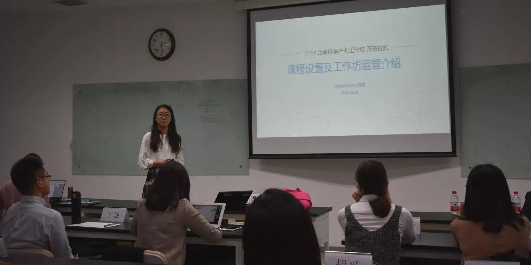 随后,由本期生命科学产业工作坊助教组代表闫晗为大家介绍本期的课程安排及嘉宾、助教阵容。闫晗提到,与前一届课程体系相似,本届工作坊将继续秉持搭建商业框架与追踪产业动态的思路,设立4个模块,共约36学时,课程持续到12月。课堂分为主题授课+提问互动+小组展示,通过与导师共进晚餐的环节,增加师生间的交流。在考核方式上,将继续采取“流动制”,考核同学们的出勤、课堂表现及课后作业,激励同学们提高参与感。