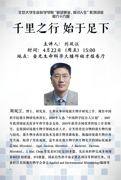 学院“展望事业,探讨人生”系列讲座第66期邀请到中科院微生物所所长刘双江教授,作主题为“千里之行 始于足下”的演讲。刘双江教授将从介绍自大学走过的路开始,希望能够和同学们分享过去的一些经历,一起体会人生中脚踏实地、一步一步地实现人生目标和价值的感受,解读与科研事业的情缘。讲座后半段有提问环节,欢迎各位老师、同学积极参加,与嘉宾互动交流。