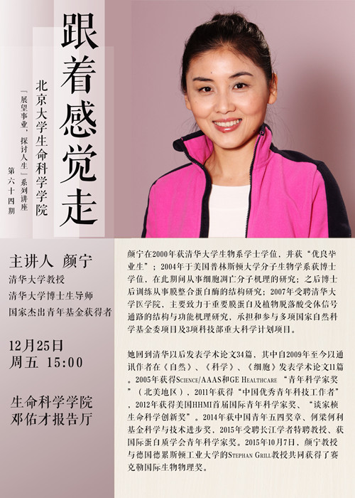 12月25日 15:00,颜宁教授将在金光生命科学大楼101报告厅作题为“跟着感觉走”的讲座,介绍她的成长之路,解读与科研事业的情缘,并分享人生的感悟。