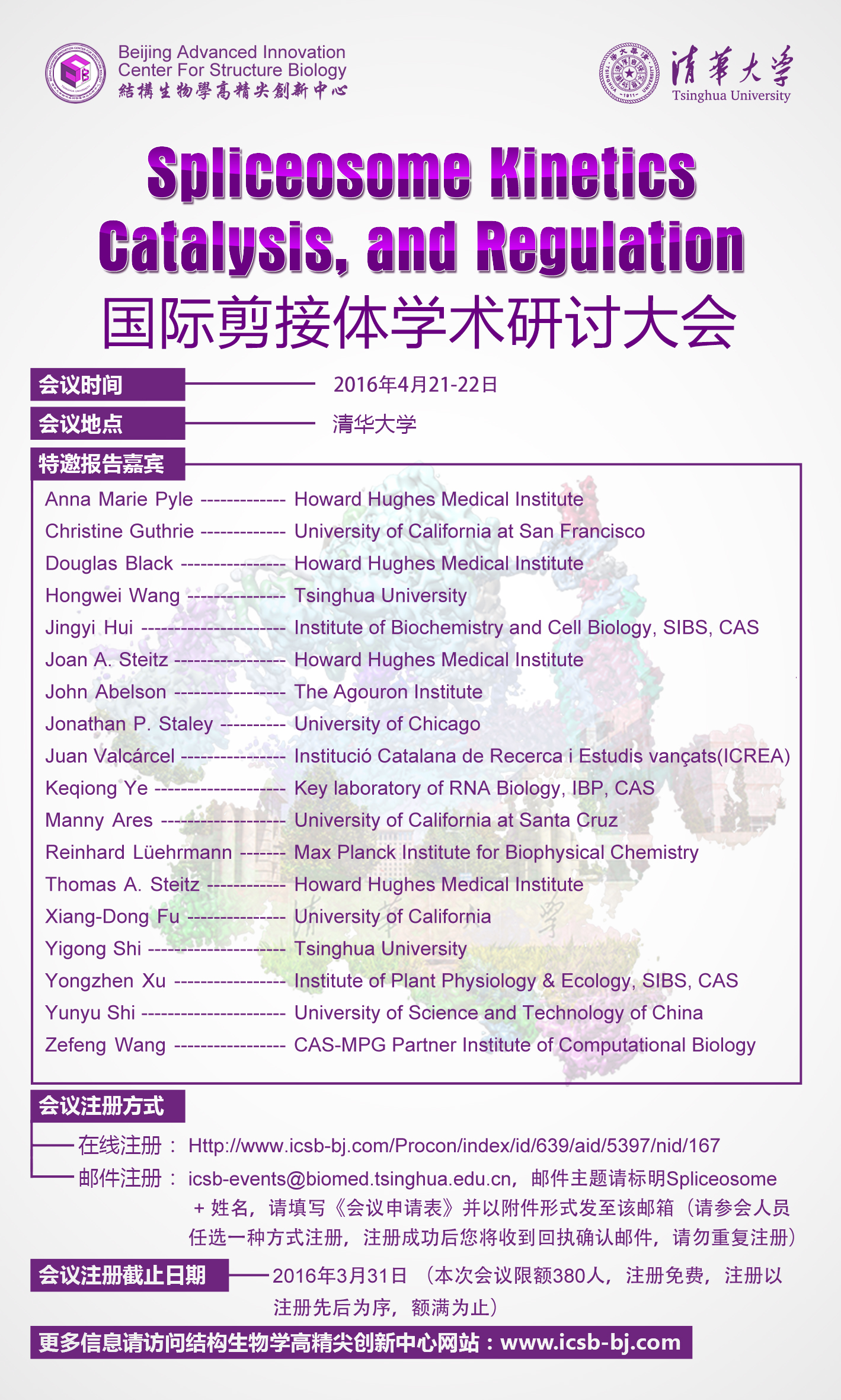 清华大学国际剪接体学术交流大会(Spliceosome kinetics, catalysis and regulation)拟定于2016年4月21至22日在清华大学举行。时值清华大学105周年校庆以及清华大学生物系建系90周年,会议作为清华大学校庆及生物系重要活动,以清华为世界生命科学领域的聚焦点,为世界顶级专家学者提供交流研讨的平台。会议拟邀请国内外知名专家和学者出席,其中包括结构生物学领域尤其是在剪接体结构研究领域的著名生物学家Reinhard Lührmann、耶鲁大学分子生物化学和生物物理Joan Steitz、世界顶尖级科学家Anna Pyle、2009年诺贝尔化学奖获得者Thomas Steitz等。会议主题将涵盖基于剪接体结构和功能的相关研究,及结构生物学其它相关方法的研究成果和新技术新方法,广泛交流在结构生物学领域取得的新成绩新经验。此次会议对清华大学生命科学领域的发展及新技术新方法的不断创新具有极其重要的里程碑意义,将会引领中国结构生物学、生命科学的战略发展。