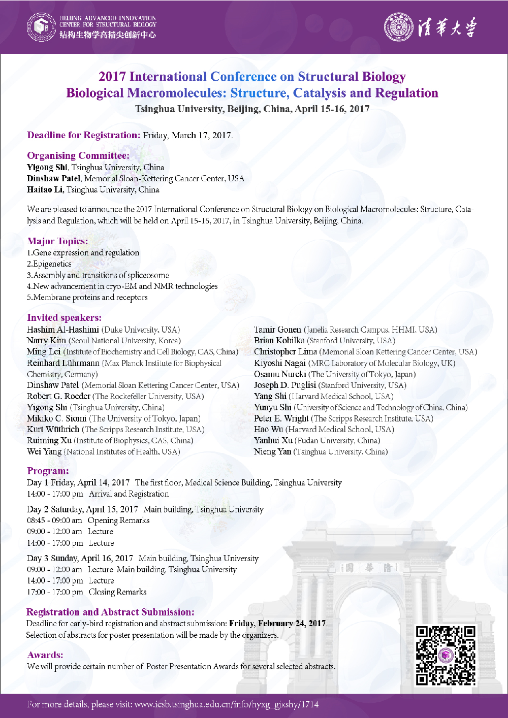 We are pleased to announce the 2017 International Conference on Structural Biology on Biological Macromolecules: Structure, Catalysis and Regulation, which will be held at the Tsinghua University, Beijing, China. The meeting will begin on April 15, and will conclude with dinner on April 16, 2017. We are looking forward to a broad-ranged meeting and abstracts are welcomed on all scientific topics related to Biological Macromolecules: Structure, Catalysis and Regulation. The conference is organized by the Beijing Advanced Innovation Center for Structural Biology.