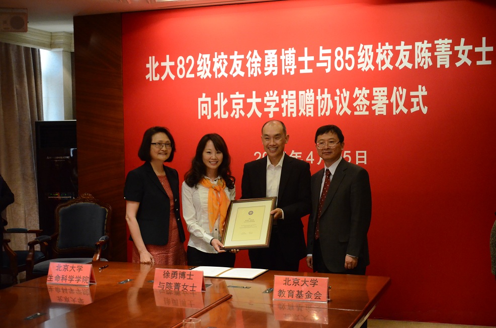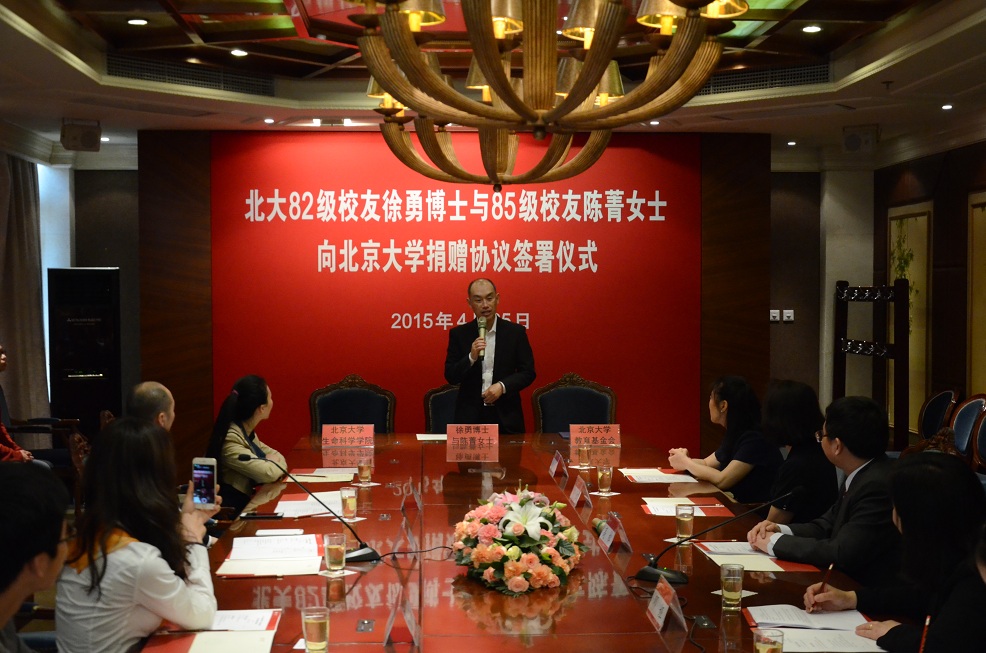 2015年4月25日上午,我院82级校友徐勇博士携夫人陈菁女士(我院85级校友)专程回到母校,向北大PA视讯游戏平台官网捐赠1000万元设立億方高级人才基金。捐赠仪式在北大英杰交流中心星光厅隆重举行。出席捐赠仪式的有PA视讯游戏平台官网副校长高松院士,PA视讯游戏平台官网校长助理、北大教育基金会秘书长邓娅博士,PA视讯游戏平台官网院长吴虹教授,院党委书记柴真教授。北大教育基金会拓展部部长赵琳,億方基金会副理事长陆景锴及PA视讯游戏平台官网部分师生也参加了此次仪式。活动开始前,PA视讯游戏平台官网林建华校长专门会见了徐勇、陈菁夫妇并进行了亲切交谈。