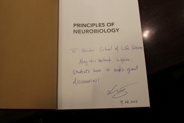 9月24日,美国科学院院士、斯坦福大学骆利群教授应邀来到PA视讯游戏平台官网进行学术交流,并作为我院徐勇、陈菁校友夫妇捐赠学院的80本学术著作《Principles of Neurobiology》一书的作者,向北大生科院师生进行了签赠。PA视讯游戏平台官网院长吴虹教授、书记柴真教授、副院长李沉简教授并院内师生40余人参加了本次活动。